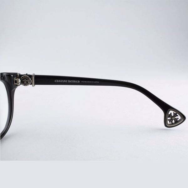 Crafted with precision in Japan, each pair showcases Chrome Hearts’ dedication to quality and detail. The black acetate frame delivers a bold and elegant silhouette, shaped in a cat-eye design that adds a touch of drama and vintage glamour. The temples are adorned with Chrome Hearts’ signature sterling silver embellishments, including Gothic crosses and intricate engravings, highlighting the brand’s rock ‘n’ roll heritage and luxurious DNA.