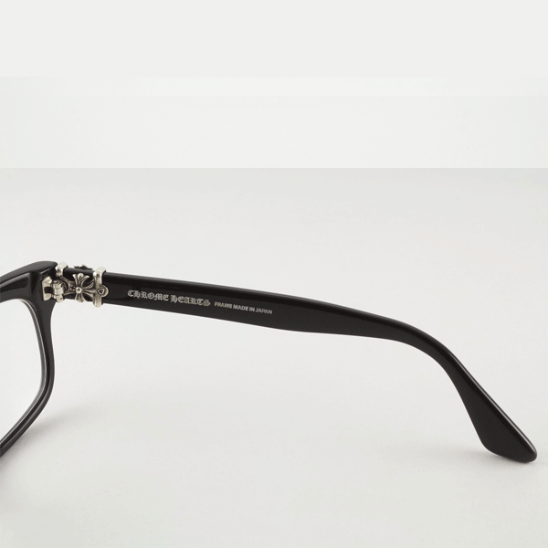 Expertly handcrafted from deep black acetate, these glasses are adorned with Chrome Hearts’ signature sterling silver motifs. Every detail from the engraved temples to the polished finish speaks of artisanal excellence and timeless design. The dark hue enhances its royal charm, while the metallic embellishments add a touch of subtle grandeur.