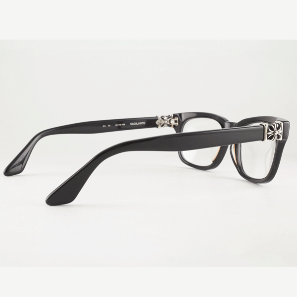 The Vagilante frame is crafted from high-quality black acetate, giving it a sleek and powerful presence. Black frames are timeless and versatile, but with Chrome Hearts’ signature touch, they go beyond the classic look. The temples are decorated with the brand’s iconic gothic-inspired engravings and silver accents, offering just the right balance between sophistication and edgy style.